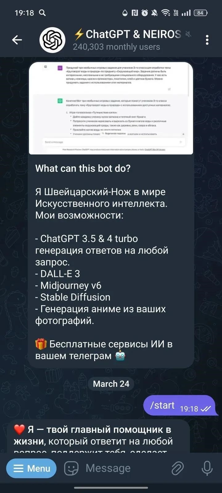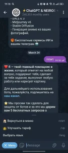 An AI-driven mini-app that delivers quick, detailed answers, handles text tasks, and generates images on demand-everything launched and managed directly within the chat interface. Designed for everyday assistance, user support, and lightweight task automation without leaving the messenger.