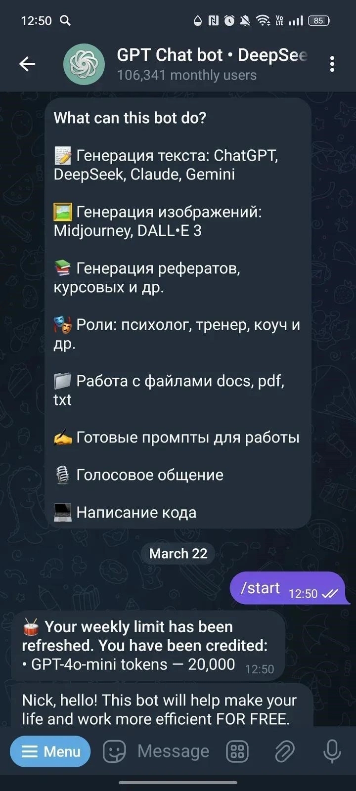 The bot is suitable for a wide audience: students looking for study help, content creators seeking inspiration, entrepreneurs who need text automation, and anyone curious about the capabilities of modern AI. Both beginners and experienced members of neural networks can take advantage of its functionality.