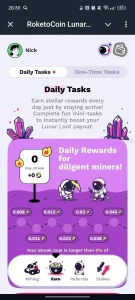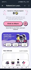 RoketoCoin Lunar Program - SocialFi mini-app built around lunar loot gameplay: you mine resources, stake them for yield, or risk them in fast in-app trading to multiply results. Progress is competitive-players climb leaderboards, join seasonal airdrops, and earn extra for inviting friends. The project frames this economy as part of the broader Roketo L2 initiative, positioning in-app assets and engagement toward future on-chain utility.