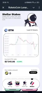 The core loop combines several deterministic and probabilistic layers. Mining produces Lunar Loot on a level-based curve; staking applies time-based multipliers; and a built-in YOLO trade mechanic lets users accept volatility for higher potential returns. Social mechanics add compounding effects: referral bonuses boost mining efficiency. The program’s messaging ties in with Roketo’s roadmap (bridging, protocol, and low-cost L3 infrastructure), suggesting eventual interoperability and utility beyond the game layer.