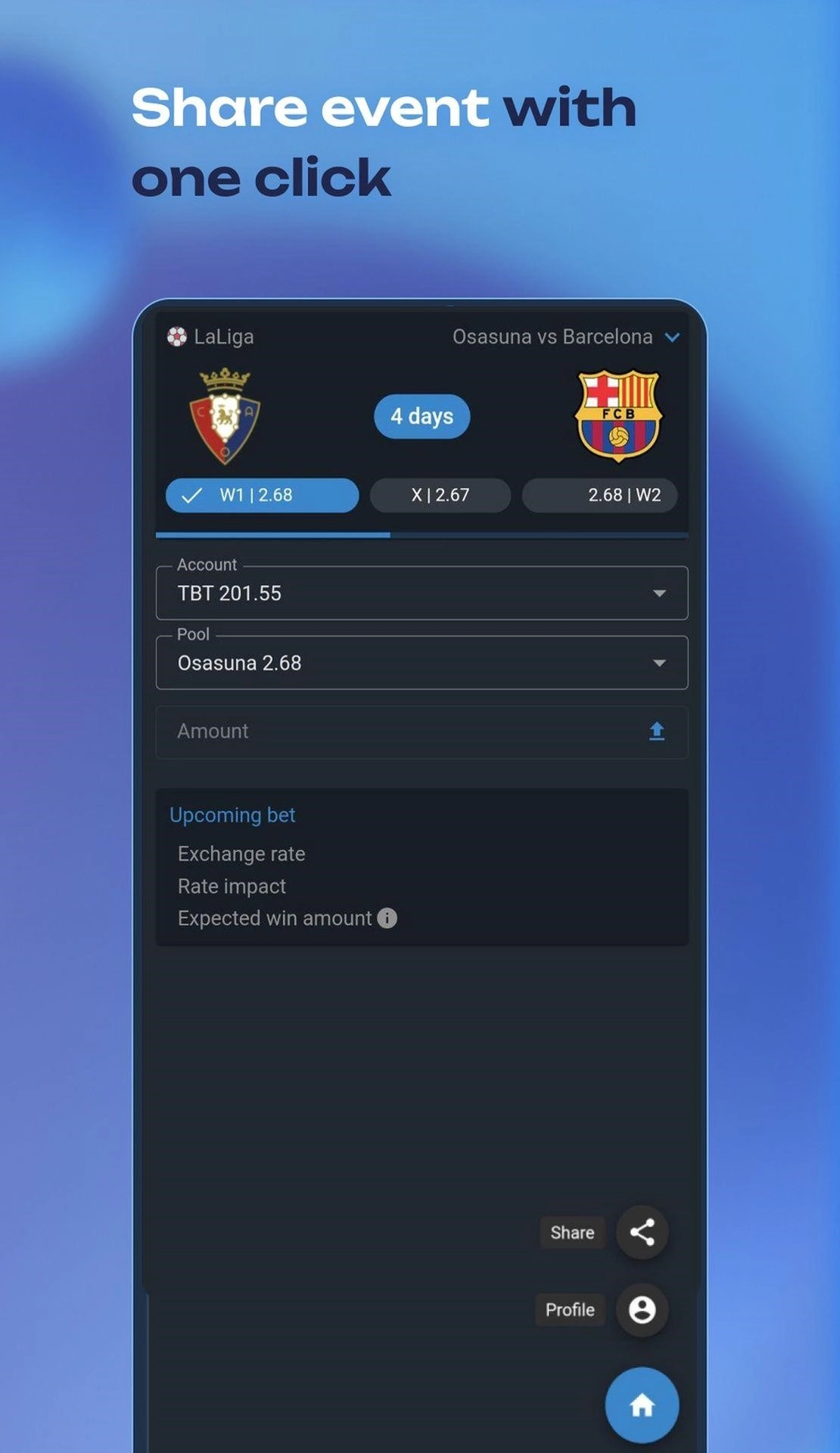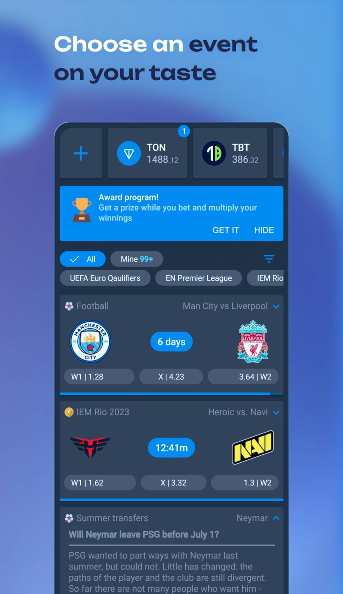 The platform provides a space for sports betting built on the TON blockchain. It focuses on transparency, speed, and security. Users can place bets on different sports events and enjoy a streamlined experience without intermediaries. The application combines traditional betting mechanics with the advantages of blockchain technology, including instant settlements and provable fairness.