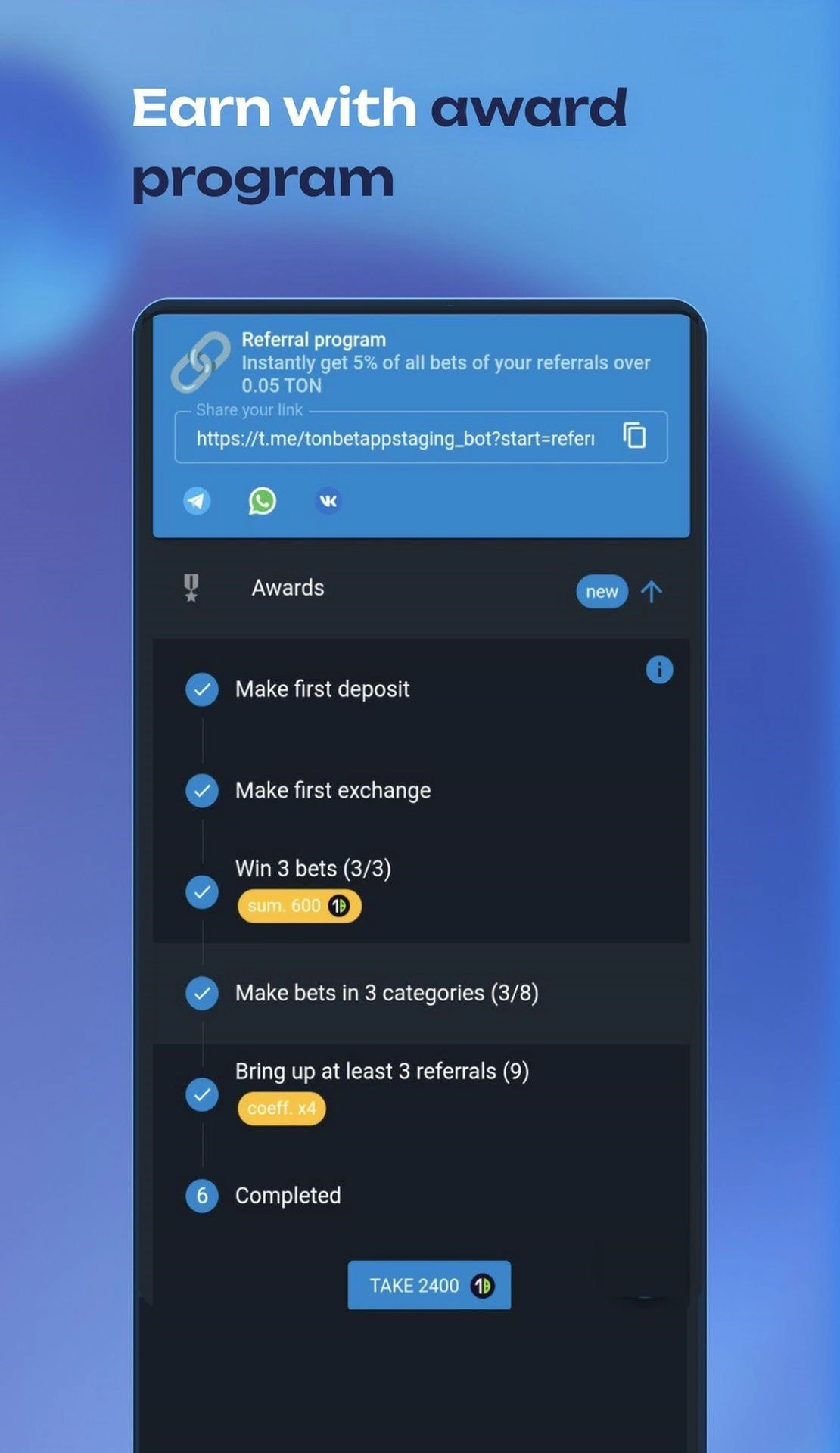 - Winnings are settled instantly thanks to TON’s transaction speed.
