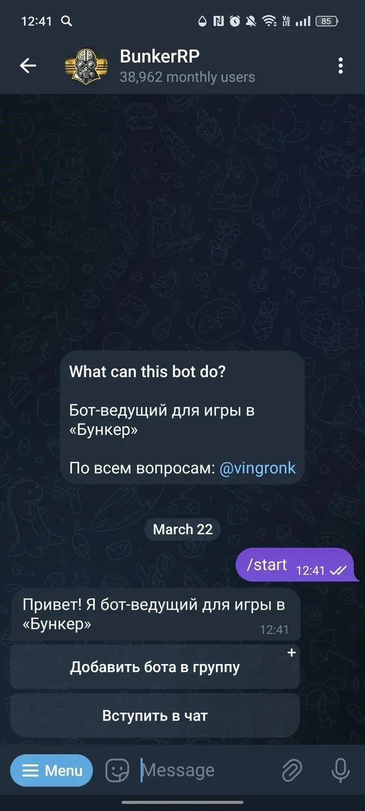 BunkerRP - interactive game assistant built around the popular survival scenario The Bunker. It helps players recreate a dramatic role-playing experience where characters must compete for limited space in a fallout shelter. The bot manages the flow of the game, distributes roles, and provides structure so participants can focus on interaction and decision-making rather than organizing the rules manually.