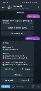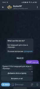 Unlike generic group role-playing or text-based games, BunkerRP provides a structured environment tailored specifically for the Bunker survival scenario. Compared to traditional offline play, it eliminates the need for a dedicated game master and reduces preparation time. In contrast with more general RPG bots, this one focuses solely on the bunker theme.