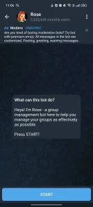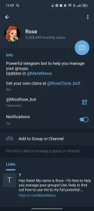 Working link to Rose on Telegram. Currently, this bot has 2 697 544 monthly active users. If the app is not working or the description seems incorrect, let us know.