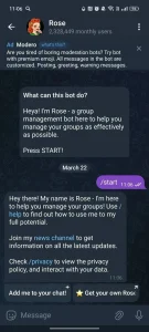 Rose - multifunctional assistant designed to simplify the management of group conversations. It provides tools for moderation, automation, and security, helping administrators keep communities organized and safe. With flexible settings and customizable filters, it adapts to both small groups and large communities with high activity.